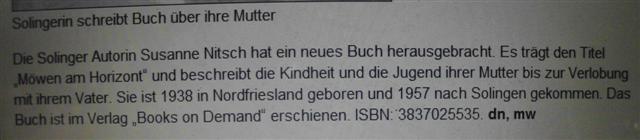 Am 11. Februar 2012 wies das Solinger Tageblatt auf mein Buch "Möwen am Horizont" hin: